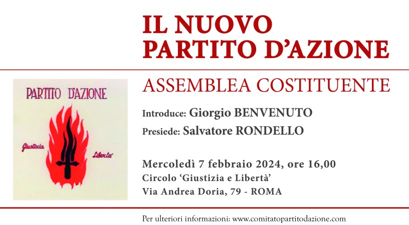 Novità ASSEMBLEA COSTITUENTE del NUOVO PARTITO d’AZIONE – 7 febbraio 2024 Date: 29.01.2024Author: Partito d'Azione invito-assemblea-costituente-07.02.2024Download Condividi: Condividi su Facebook (Si apre in una nuova finestra) Facebook Altro Stampa (Si apre in una nuova finestra) Stampa Condividi su WhatsApp (Si apre in una nuova finestra) WhatsApp Mi piace Caricamento... Correlati